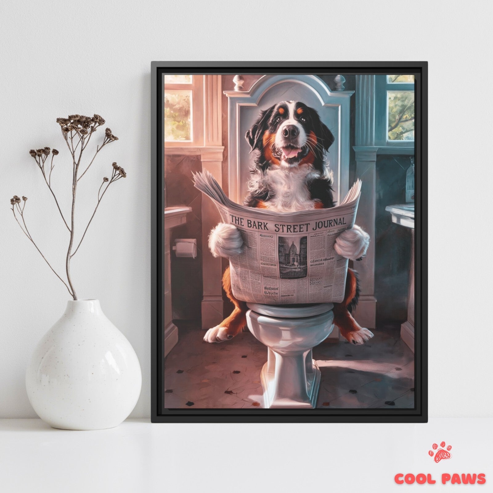 Bernese Mountain Dog Reading the Newspaper on the Toilet