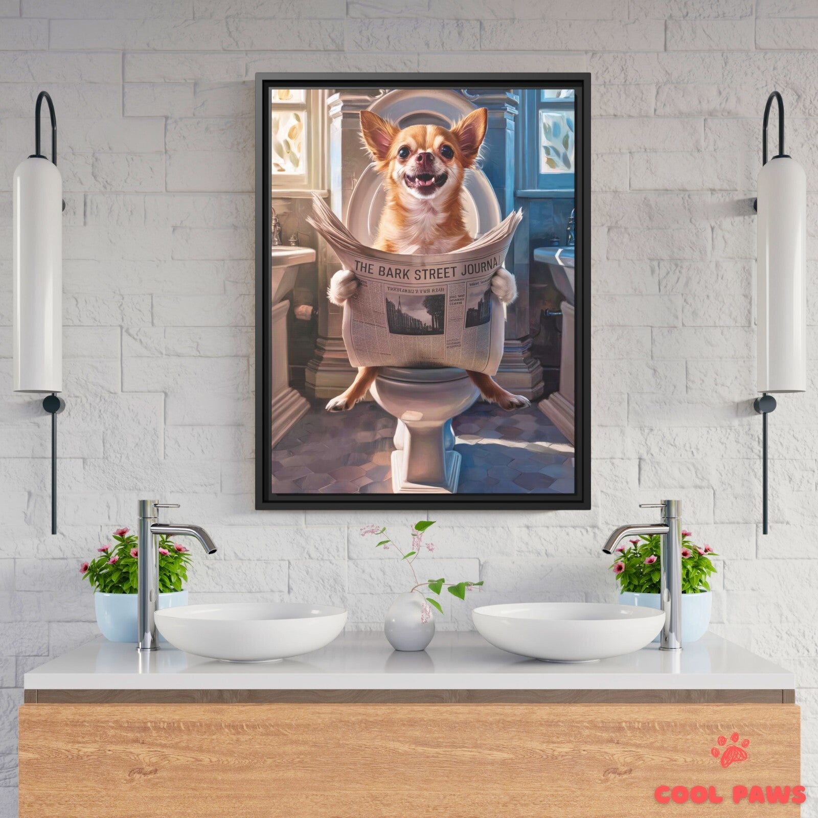 Chihuahua Reading the Newspaper on the Toilet