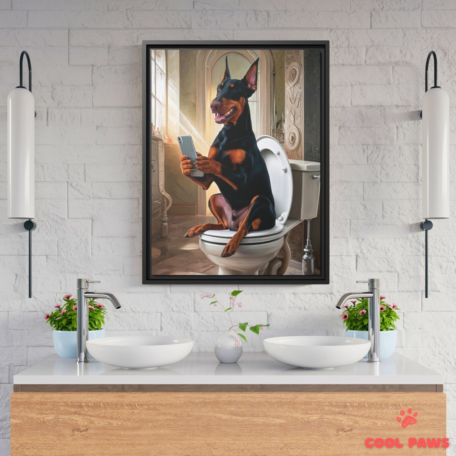Doberman on the Toilet with a Smartphone