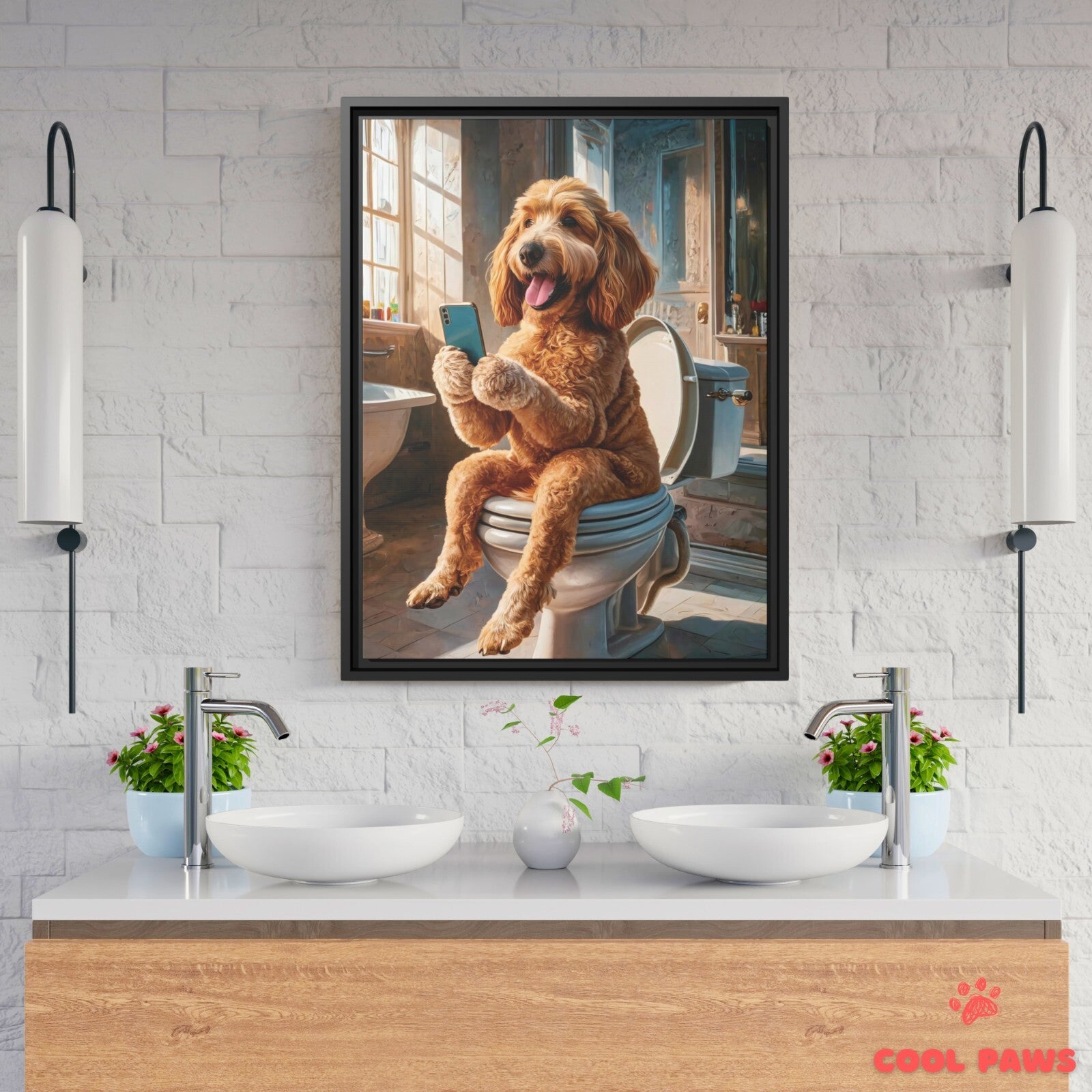 Goldendoodle on the Toilet with a Smartphone