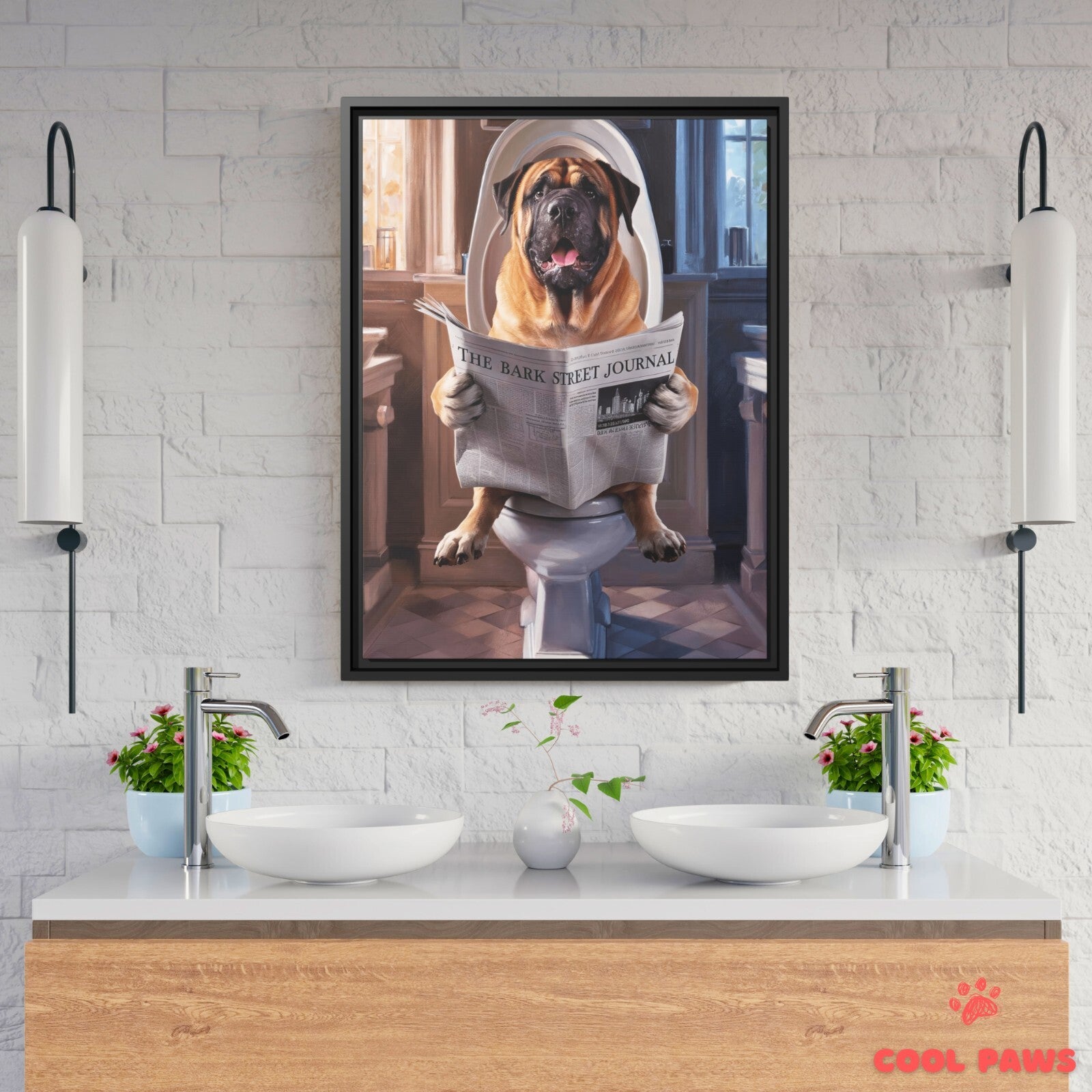 Mastiff Reading the Newspaper on the Toilet
