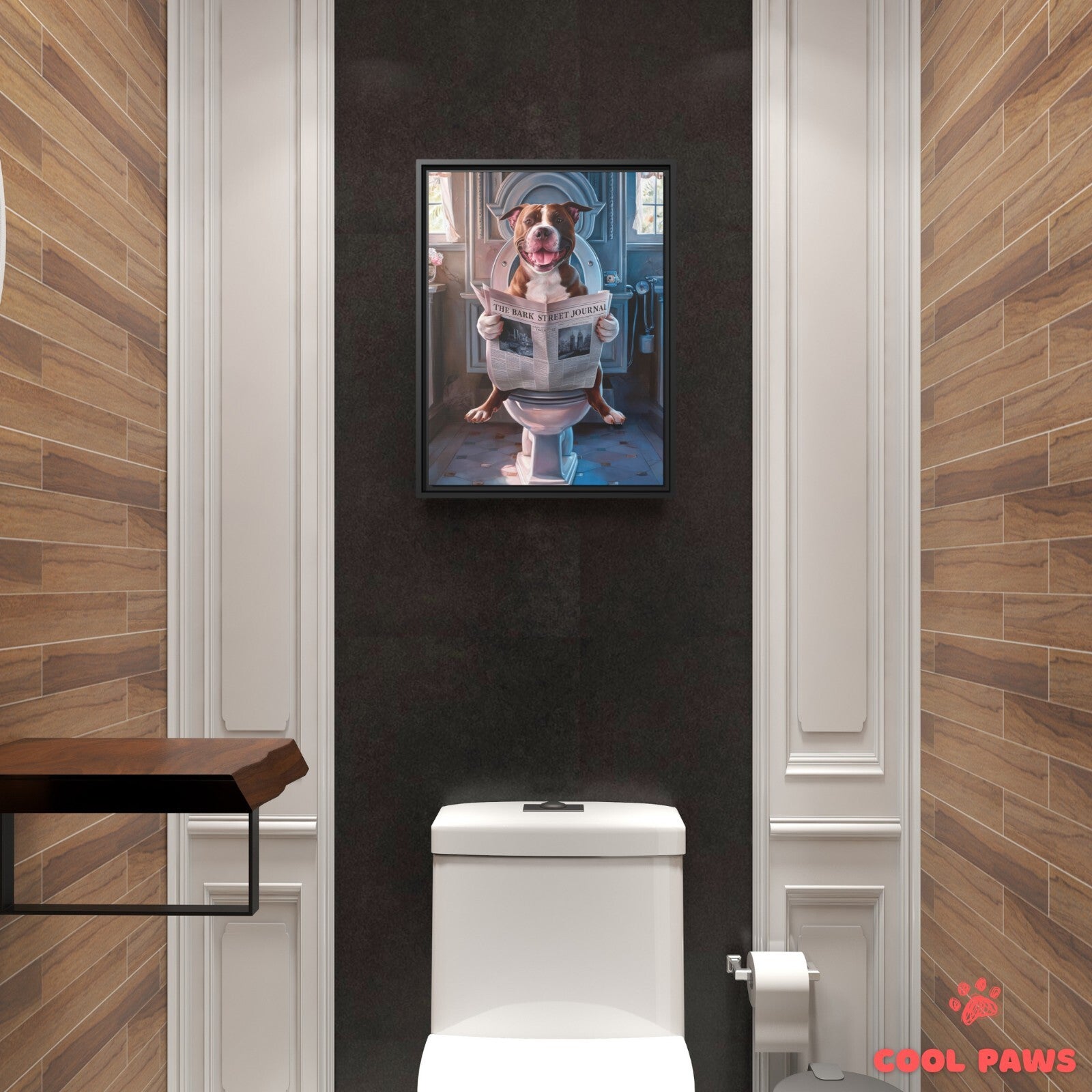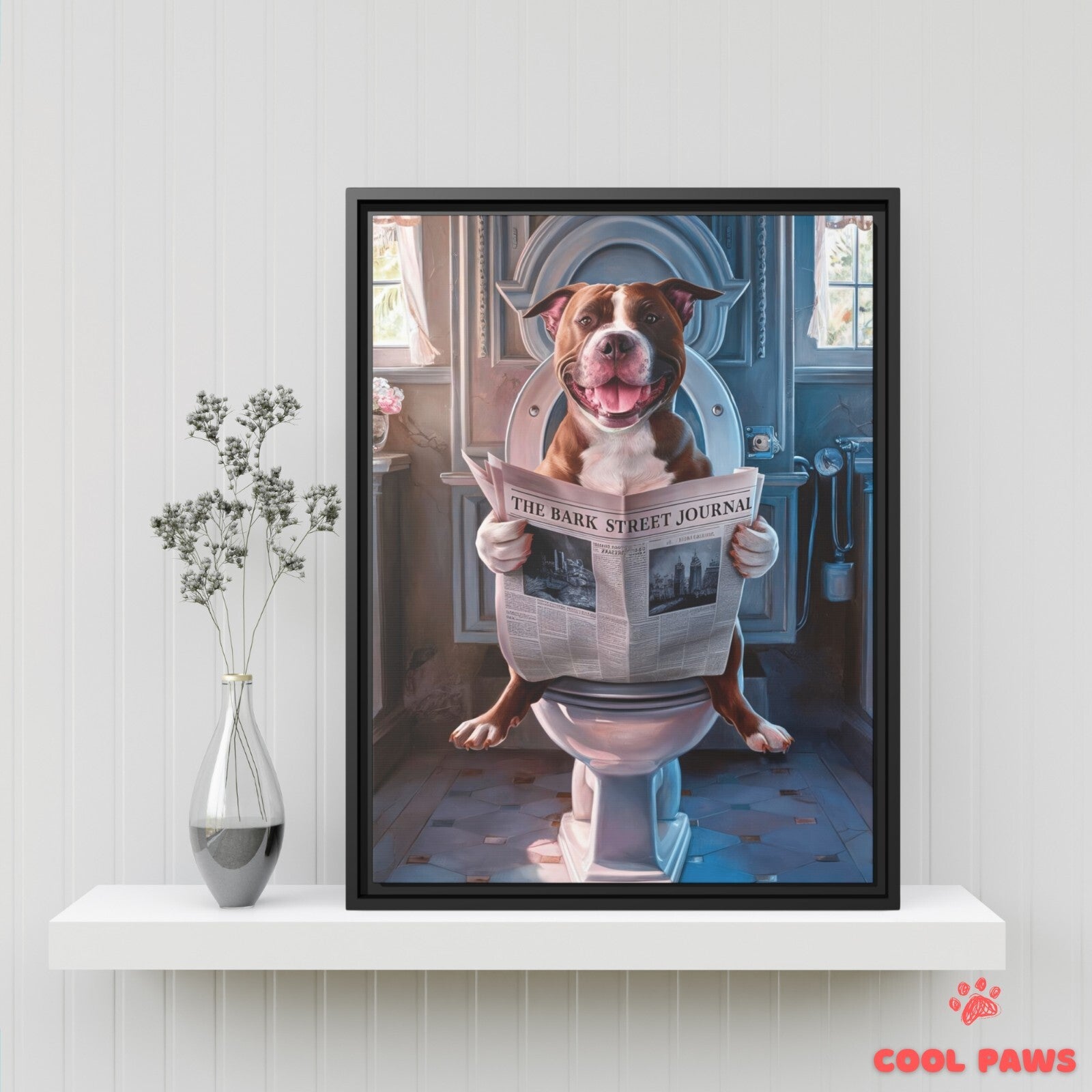 Pit Bull Reading the Newspaper on the Toilet