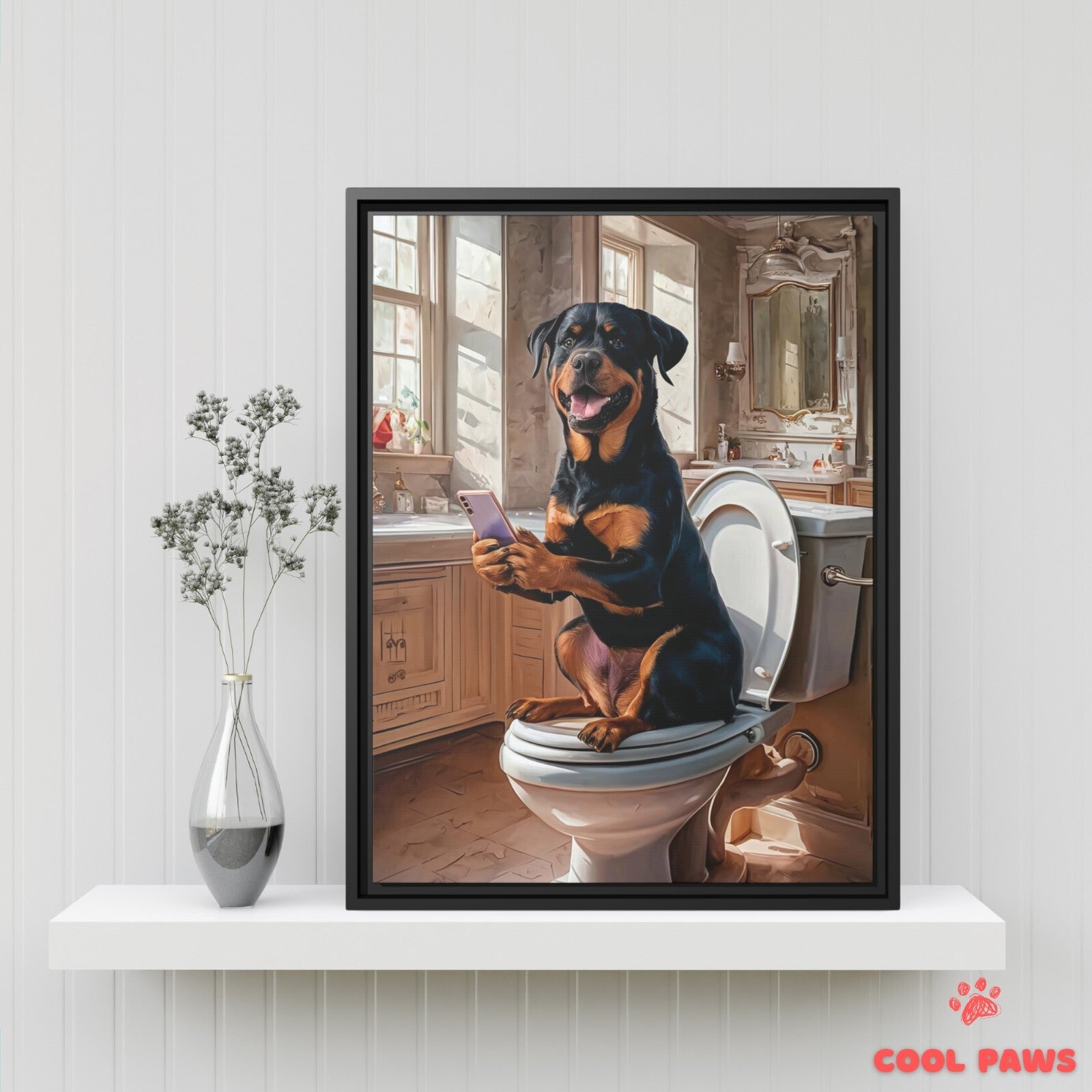 Rottweiler on the Toilet with a Smartphone