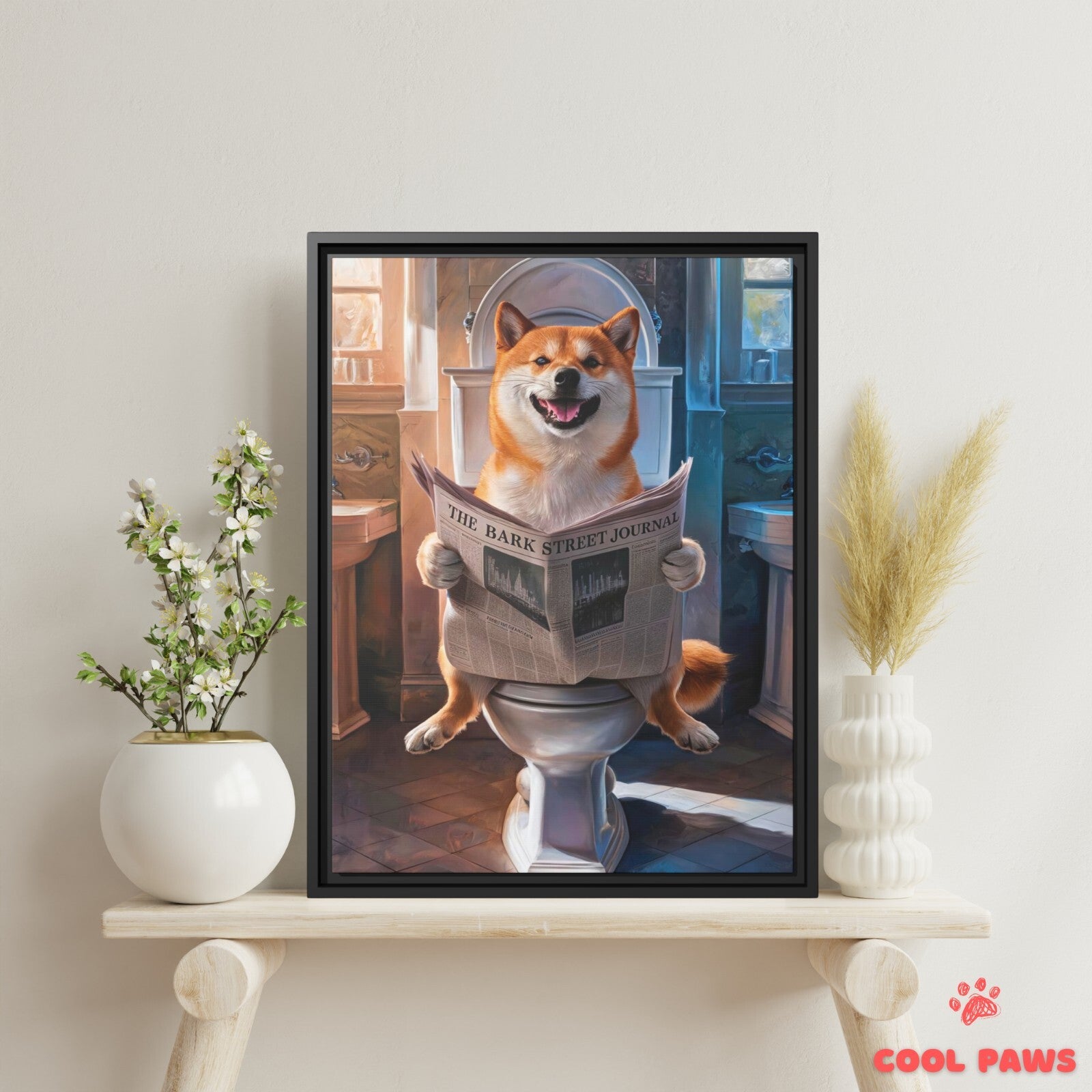 Shiba Inu Reading the Newspaper on the Toilet